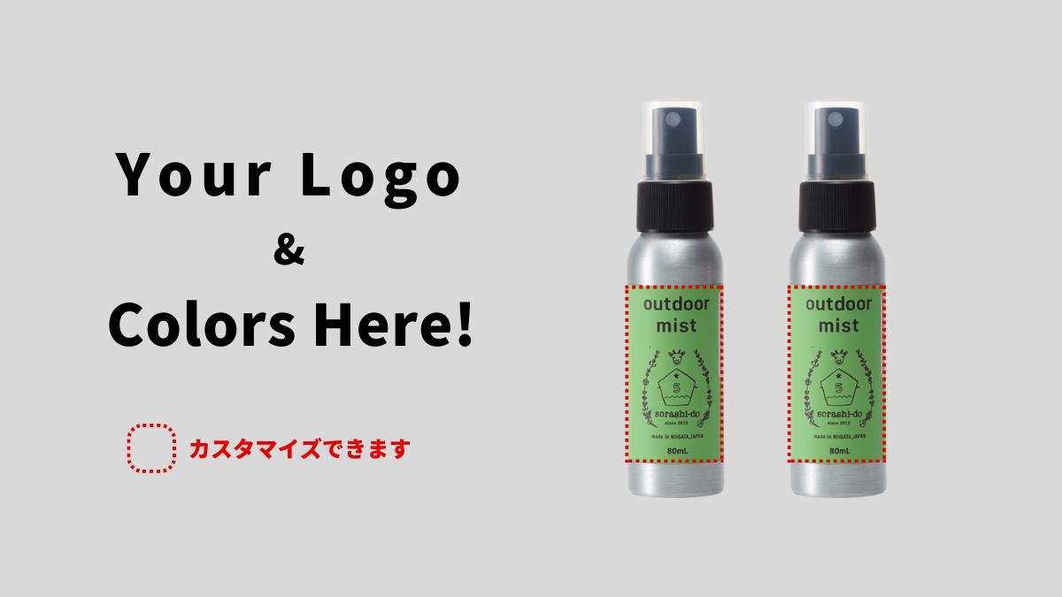 夏季シーズンのノベルティに最適なアウトドアボディミストです。レモングラス、ペパーミント、ユーカリなどのアロマブレンドを使用したこちらのスプレーは、主成分の水に新潟県産越後杉を水蒸気蒸留した水を採用。肌荒れやアレルギーの原因となるディートを一切使用していないため、生後6ヶ月のお子様からやお肌の弱い方にも安心してお使いいただけます。虫が嫌がる精油の香りで、ボディスプレーとして虫除け対策に使用するのはもちろん、ルームスプレーとしても活用できる万能アイテム。ハーブのスーッとする爽やかな香りはオフィスやご自宅でのリフレッシュに最適です。就労支援施設で丁寧に製造された、応援にもつながる社会貢献型のノベルティです。